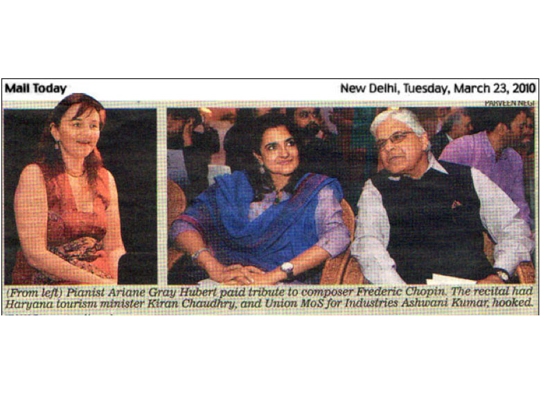 It was cross-cultural connections at their best – Frederic Chopin’s compositions played by a French artiste inspired by Indian musical greats. The occasion was a piano recital by Ariane Gray Hubert in tribute to master composer Chopin at the Embassy of France on Friday evening. Ariane, a singer and composer who started her musical journey with the piano at the age of four, rendered an engrossing hour long performance that reflected the musical genius of the Warsaw-born Chopin through his famous compositions such as the Preludes, which are short collected pieces that fuse tension, poetry and daring. The Mazurkas, on the other hand, had lyrics that captured the breadth-and-cadence of his musical-line. The concert, which opened with the Prelude, written by thecomposer in 1836 was interspersed with narration by the planist about each composition to the invited audience, which comprised of Jerome Bonnafont, ambassador of France to India: Karan Singh, chairman, Indian council for cultural Relations (ICCR); Rajyasabha MP from Rajasthan, Najma Heptullah and other embassy officials. The event concluded with La Note Bleue, a personal composition by Hubert meant as a tribute to Chopin. As a musician, inspired by Hindustani classical vocalist Bhimsen Joshi; Ali AkbarKhan, the late sarod artiste and M.S Subbulakshmi, the late carnatic musician, Hubert was all praise for the concept and essence of time in Indian music. “Indian music has a very organic combination with an essence of natural time embedded in it.” said the artist who has performed up to 15 concerts a year in India, since her first trip to the country 11 years ago on an invitation from ICCR. The concert also heralds the arrival of “Namaste-France” the festival of India in France beginning April 14, as the curtalns come down on “Bonjour India,” the festival of France in India.